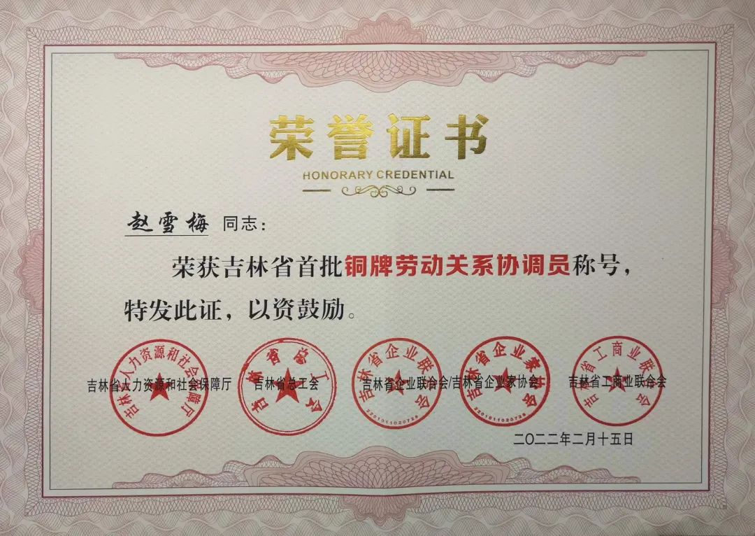 按照《吉林省勞動關(guān)系“和諧同行”能力提升三年行動計劃實施方案》和《關(guān)于加強勞動關(guān)系協(xié)調(diào)員隊伍建設(shè)的通知》要求,各級協(xié)調(diào)勞動關(guān)系三方在全省范圍選樹了一批業(yè)務(wù)能力強、工作業(yè)績突出的金、銀、銅牌勞動關(guān)系協(xié)調(diào)員。經(jīng)推薦、初審、復(fù)審,小棉襖集團董事會秘書趙雪梅被授予吉林省首批“銅牌勞動關(guān)系協(xié)調(diào)員”稱號,受疫情影響不能赴長春開會進行表彰,李鋼局長現(xiàn)場為趙雪梅頒發(fā)榮譽證書。