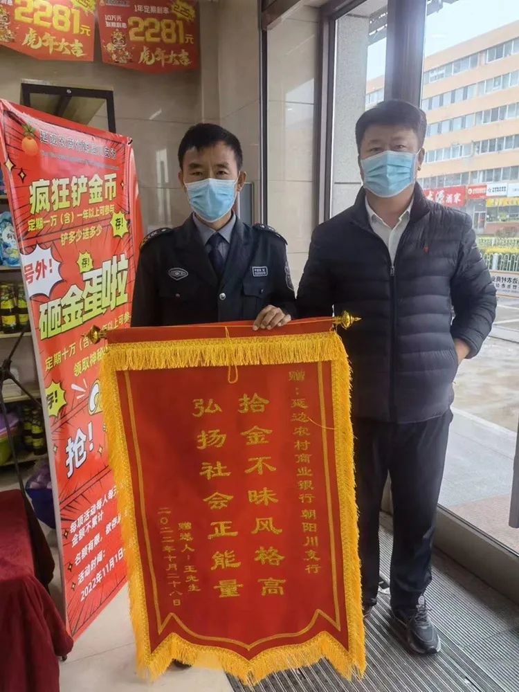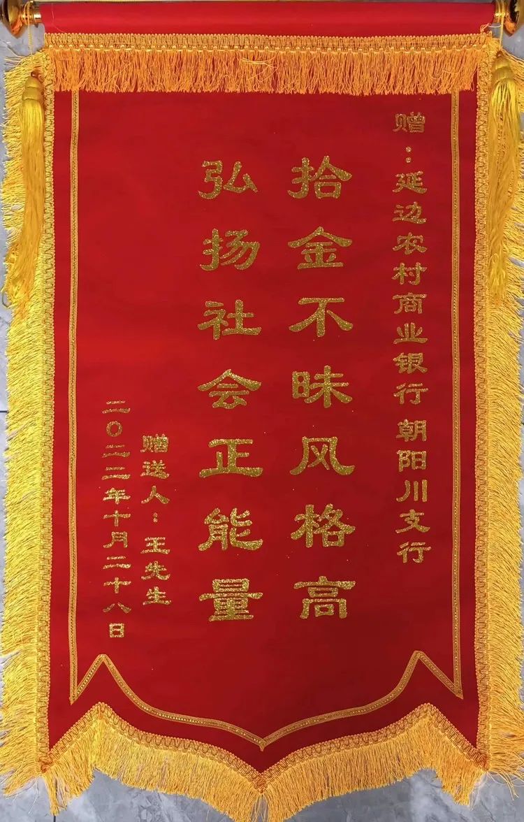 10月29日,延吉市民王先生來(lái)到延邊農(nóng)村商業(yè)銀行朝陽(yáng)川支行,將一面寫(xiě)有“拾金不昧風(fēng)格高,弘揚(yáng)社會(huì)正能量”的錦旗送至銀行大廳,感謝小棉襖集團(tuán)派駐保安員劉兆德拾金不昧的精神。