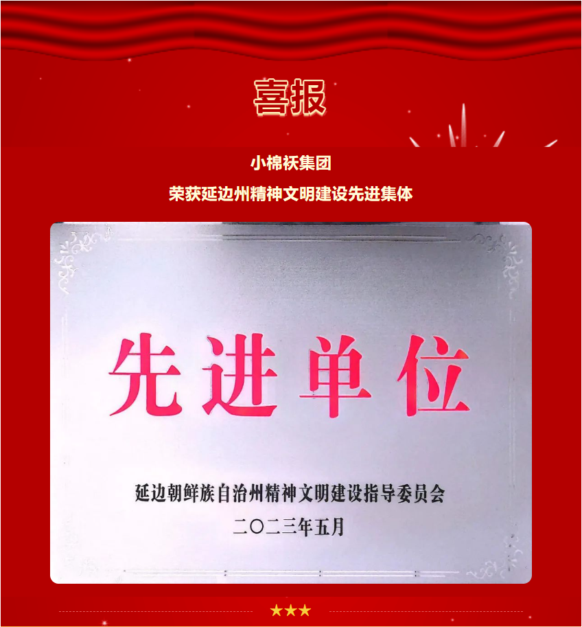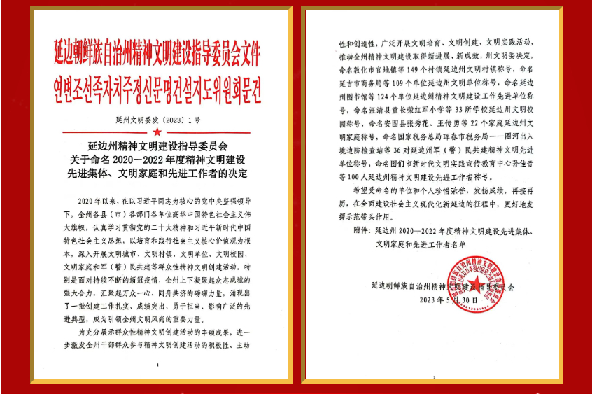 2023年6月,為充分展示群眾性精神文明創(chuàng)建活動的豐碩成果,進一步激發(fā)全州干部群眾參與精神文明創(chuàng)建活動的積極性、主動性和創(chuàng)造性,廣泛開展文明培育、文明創(chuàng)建、文明實踐活動,推動全州精神文明建設取得新進展、新成效,延邊州文明委決定,命名小棉襖集團為延邊州2020-2022年度精神文明建設先進集體稱號。